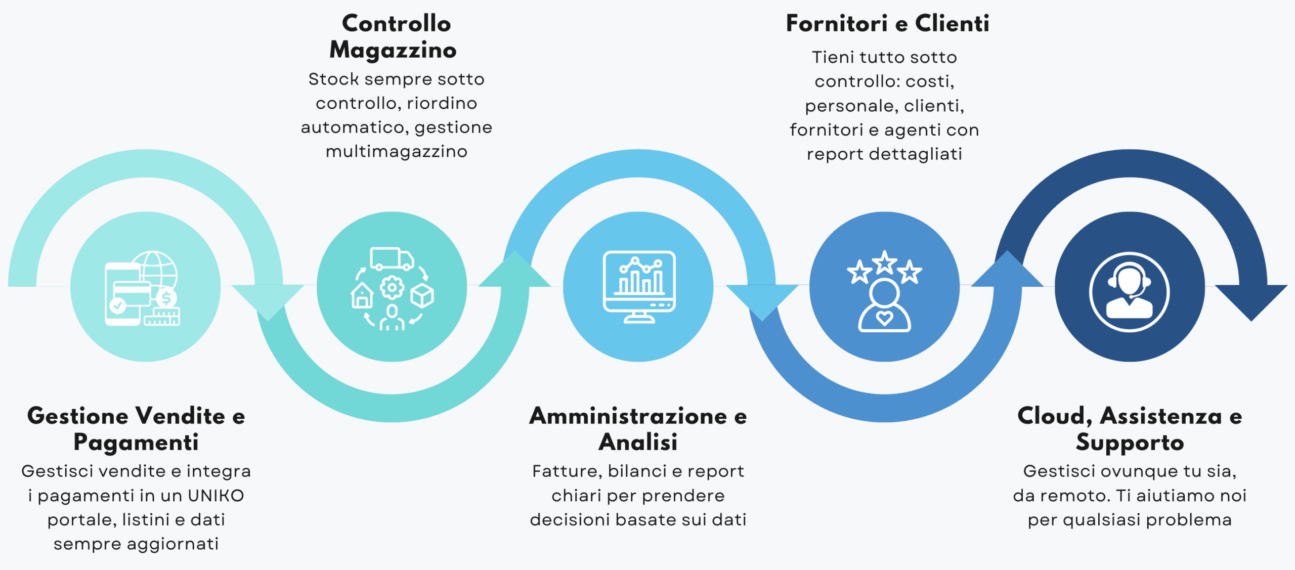 Uniko è altamente configurabile con oltre 400 impostazioni disponibili, backup in cloud, gestione ordini, e moduli aggiuntivi.